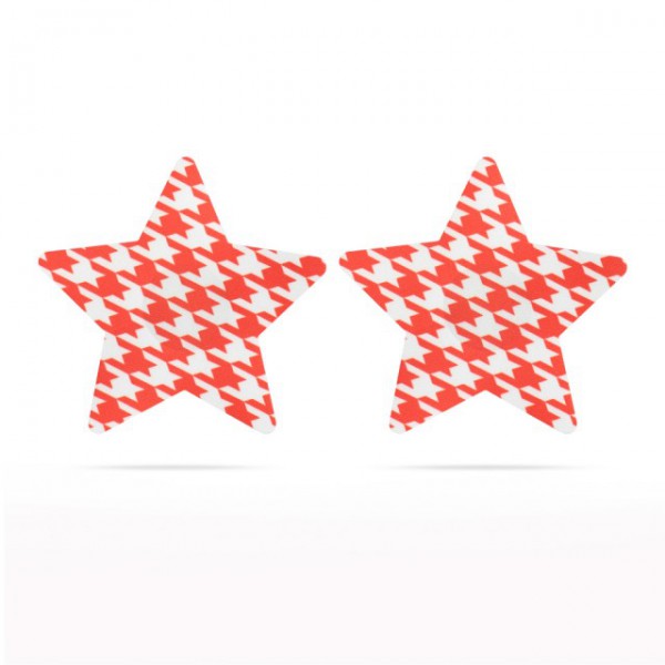 Стикини в виде звезд с клетчатым принтом черно-белого и черно-красного цвета. Фиксируются на соске при помощи клейкого слоя, совершенно безопасного для кожи. Стикини многоразовые: после использования промыть и приклеить защитную пленочку