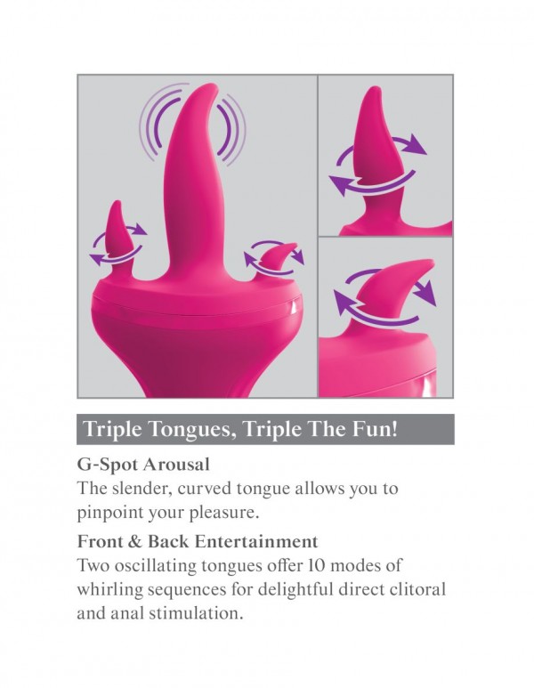 Вибратор представляет собой 3 язычка, 2 из которых предназначены для стимуляции клитора и ануса, а центральный для ласк лона и стимуляции G-точки! Вагинальный язычок обладает мощной вибрацией, а мини язычки вращаются в различных направлениях!